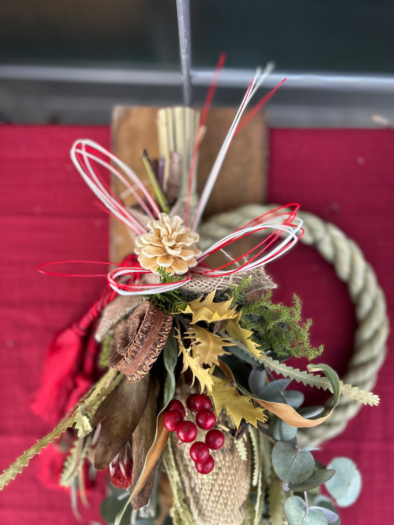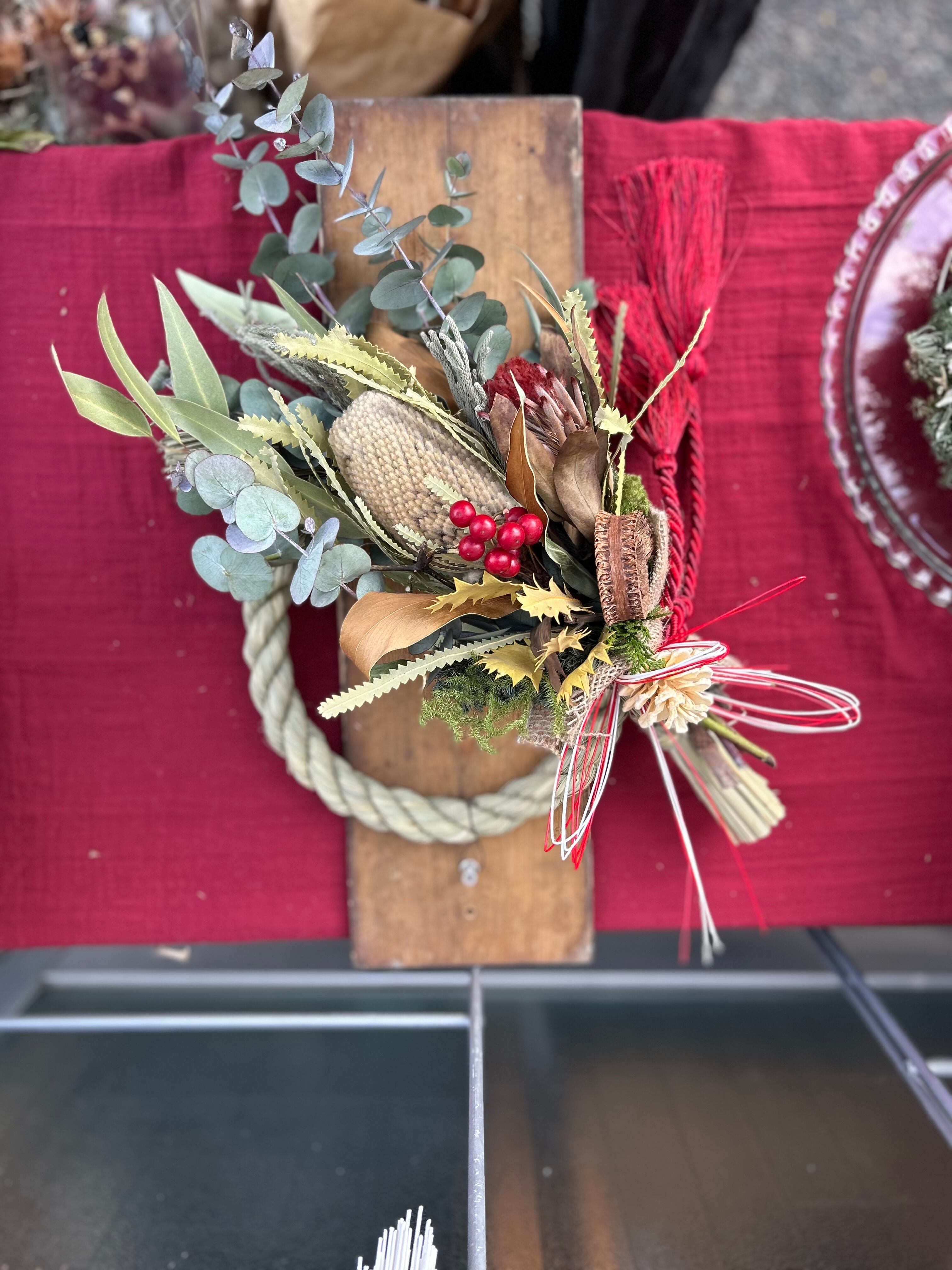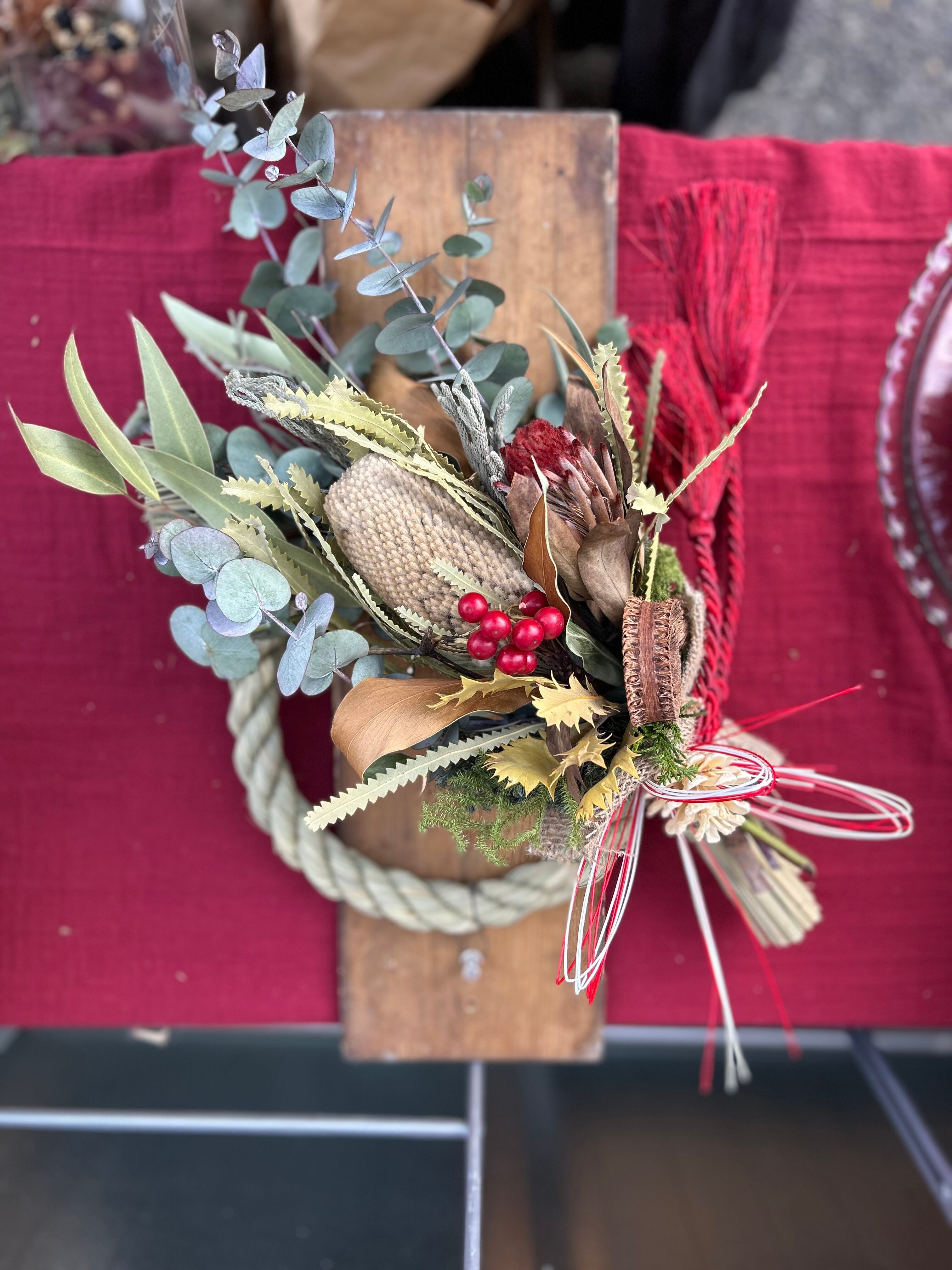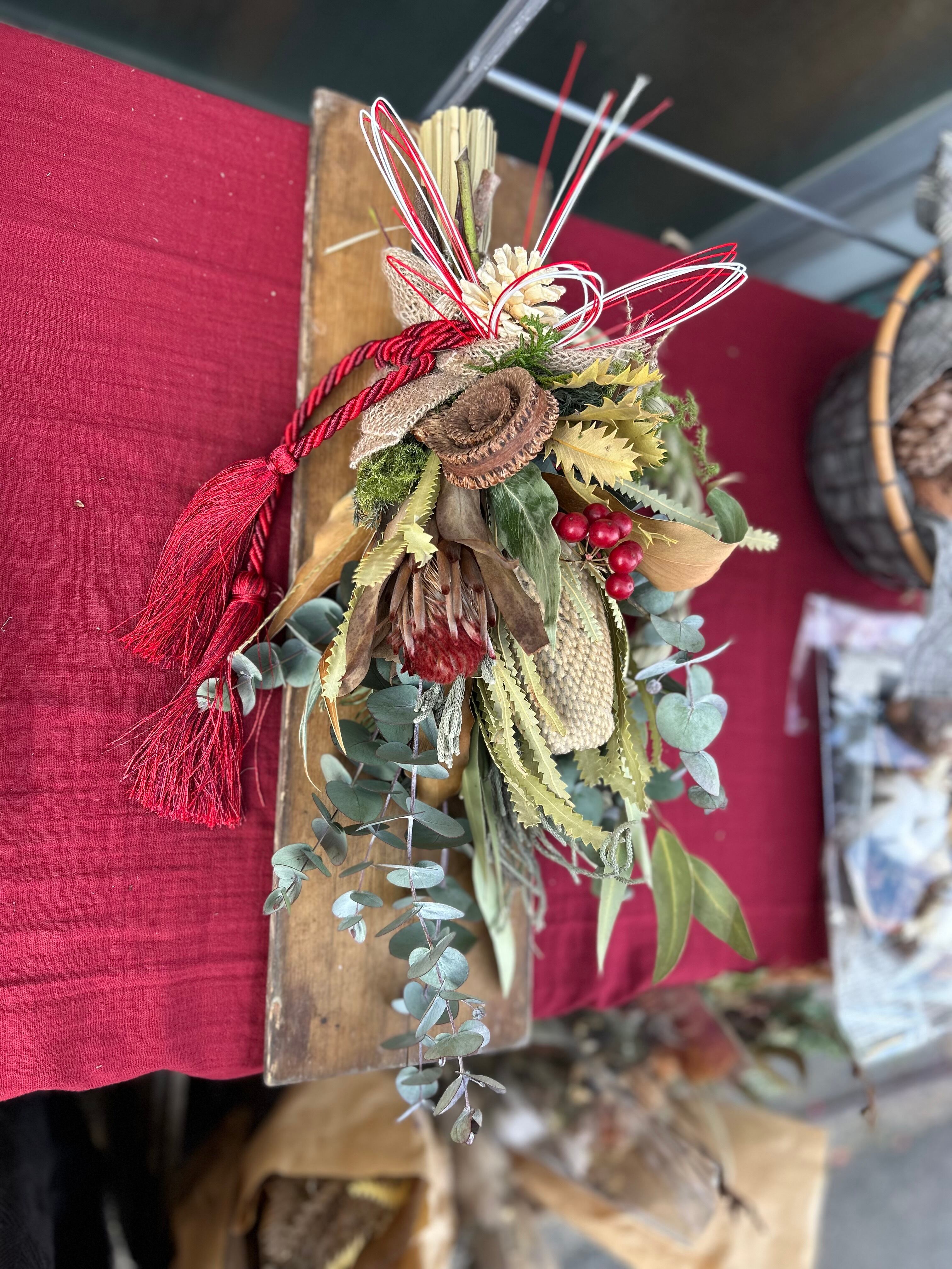 オールシーズンお部屋に飾って欲しいネイティブフラワーのスワッグをしめ縄飾りに仕立てました